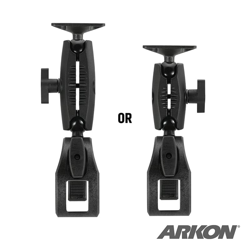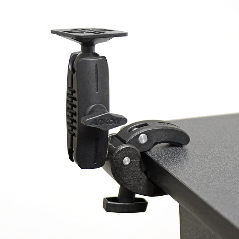 Arkon’s RMCPMAMPS Robust Clamp Mount is a highly versatile locking clamp mount with a unique jaw design that has an extra wide clamping range for both flat (including tables, desks, counters, shelves) and tubular (including handlebars, roll bars, wheelchairs, strollers, grocery carts, golf carts) surfaces, including small posts. It is compatible with 4-Hole AMPS holders and adapters (sold separately). This package includes a Robust Clamp Pedestal, a 25mm to AMPS adapter, one 3.75″ Standard Robust Mount Shaft, one 2.75″Small Robust Shaft, and optional security knob and hardware. This versatile clamp mount is made of high-strength composite materials with corrosion-resistant stainless steel hardware, and conveniently installs and removes without any tools on flat as well as round, square, or odd shaped bars and rails. Choose from one of either the 3.75″ or 2.75″Robust Mount Shafts included to fit your particular mounting environment. Clamp to a table, desk, or other surfaces from .2 inches to 1.75 inches (5mm to 44.5mm) thick. Or, use on a wheelchair, as a microphone stand mount, or on any handlebar or post .25 inches to 2 inches (6.5mm to 51mm) in diameter. The mount installs easily with a turn of the clamp’s knob. The clamp is padded in order to provide gripping support and protection to the mounting surface. An optional removable security knob is provided to deter theft. Simply remove the existing knob and tighten the clamp with the security knob. Once tightened, the security knob can be removed to deter theft. Use the Robust Clamp to mount tablets, smartphones, cameras or other devices virtually anywhere.